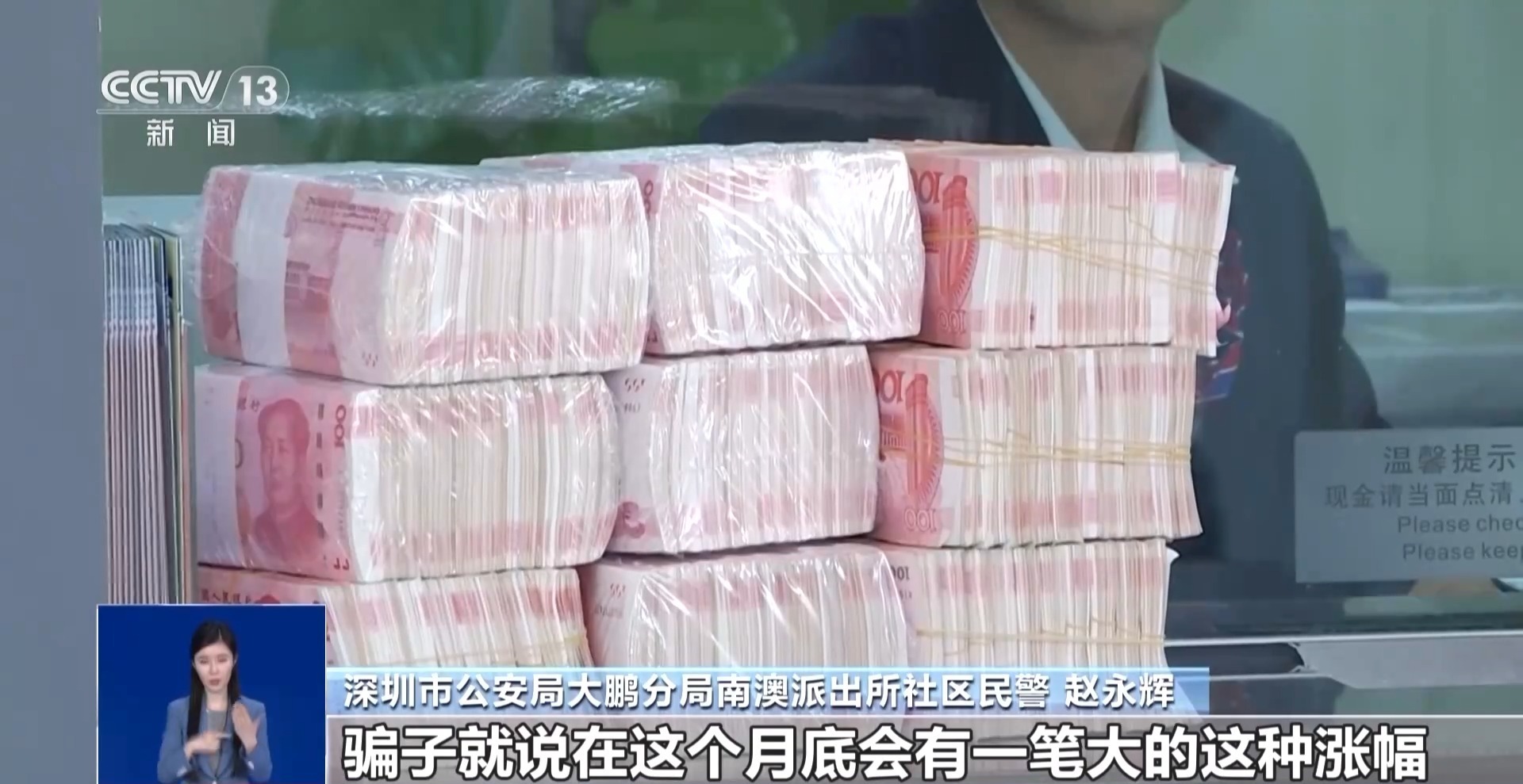 深圳市公安局大鹏分局南澳派出所社区民警 赵永辉:其实他8月初的时候就已经被人洗脑了钱盈配,开始进入一个炒股的平台和聊天的群里面,骗子就说在这个月底会有一笔大的涨幅,每个人大概要投资50万到100万才会有更多的收益,他就自己跑到银行去想把钱转给对方。